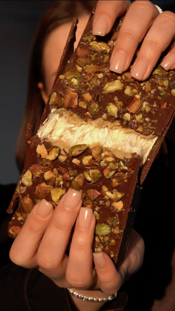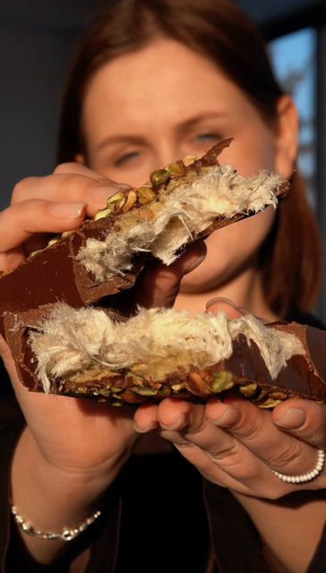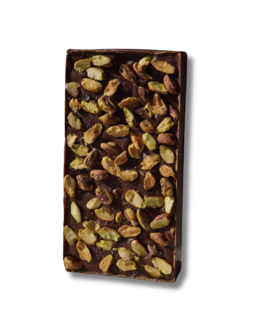 Кремовий бельгійський молочний шоколад гармонійно поєднується з 100% натуральною фісташковою пастою, доповненою шовковистим пішманіє та цілими шматочками преміальних фісташок.