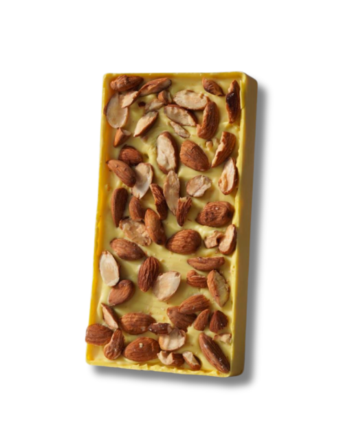 Ніжний білий шоколад в поєднанні з легким пішманіє з апельсиновим смаком відкриває соковиті цитрусові нотки, створюючи ефект стиглого апельсина, щойно зірваного з гілки. А хрусткий мигдаль доповнює цю симфонію текстур, додаючи теплі горіхові нотки та довершений післясмак.