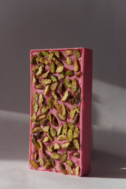 Коли білий шоколад поєднується з фісташковою пастою та повітряним полуничним пішманіє, народжується Pink Velvet – шоколад, який змінює уявлення про смак.