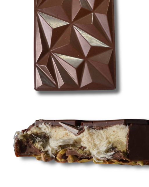 Кремовий бельгійський молочний шоколад гармонійно поєднується з 100% натуральною фісташковою пастою, доповненою шовковистим пішманіє та цілими шматочками преміальних фісташок.
