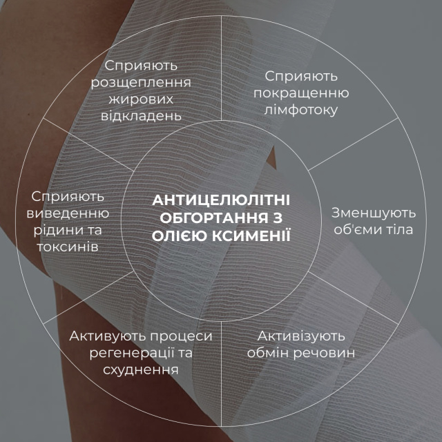 Обгортання з олією ксименії просякнуті речовиною, складники якої активізують обмін речовин, роблять шкіру пружнішою та еластичнішою. Процедура для зменшення проявів целюліту, підвищення тонусу шкіри та укріплення судин.