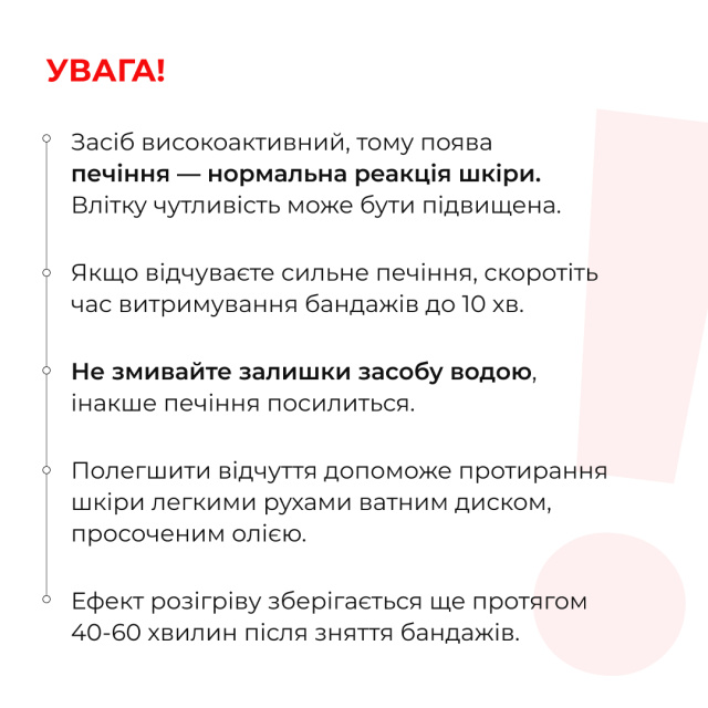 - Зніміть бинти та акуратно масажуйте шкіру для повного вбирання рідини.