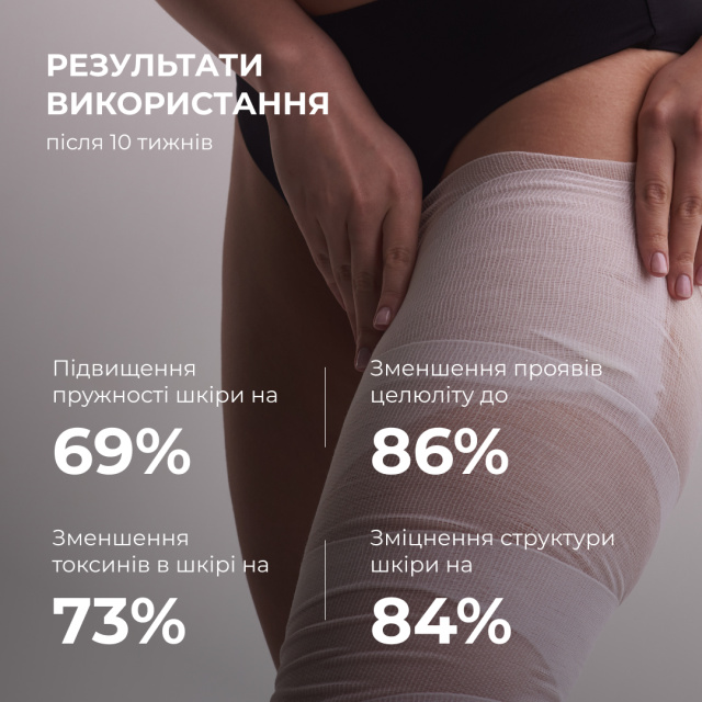 Дослідження демонструють, що після курсу використання еластичність шкіри покращується на 71%, вона стає більш підтягнутою та пружною. Завдяки активному лімфодренажному ефекту набряклість зменшується на 80%, а виведення зайвої рідини досягає 77%, що сприяє формуванню більш чітких контурів тіла. Також спостерігається значне зменшення проявів целюліту – до 86%, що свідчить про ефективну дію компонентів, які активізують мікроциркуляцію та допомагають розгладити мікрорельєф шкіри.