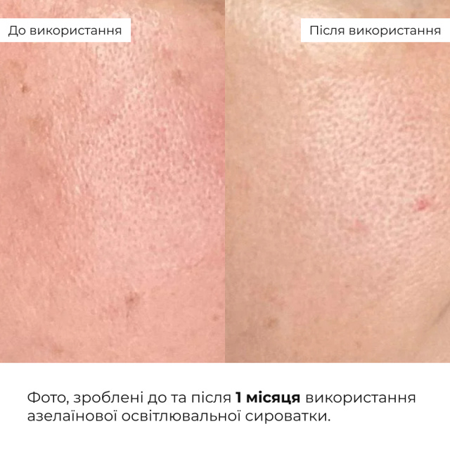 Через 6 тижнів використання азелаїнової сироватки сліди постакне зменшилися на 33%. Жирний блиск на шкірі зменшився на 54%, тобто сироватка добре регулює вироблення себуму. Також рівень зволоженості шкіри зріс на 41%, що вказує на її зволожувальні властивості. Крім того, пігментні плями стали менш вираженими — їх освітлення досягло 36%.