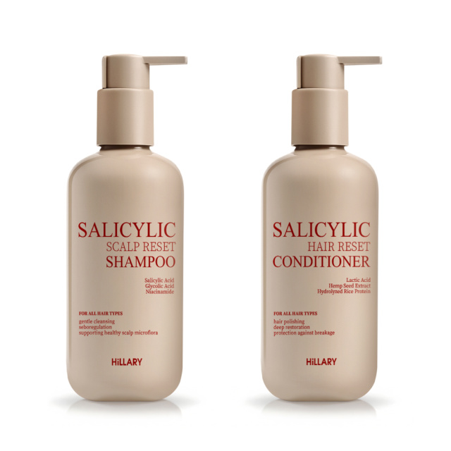 Hillary Salicylic Hair & Scalp Restoration Set – комплексний догляд із дерматологічним підходом. Шампунь ефективно бореться з жирністю, лупою та дискомфортом шкіри голови, нормалізує pH і стимулює ріст волосся. Кондиціонер глибоко відновлює довжину, зменшує ламкість і посічення, повертає волоссю гладкість, блиск і еластичність.