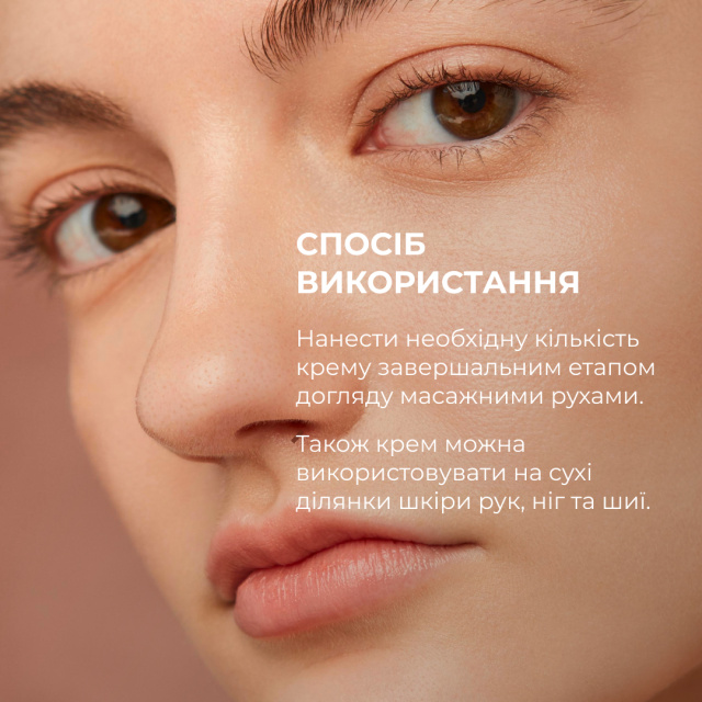 2. Відновлювальний крем з керамідами та постбіотиками. Нанести необхідну кількість крему завершальним етапом догляду м’якими масажними рухами. Також крем можна використовувати на сухі ділянки шкіри рук, ніг та шиї.