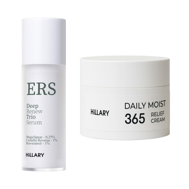 Набір створений для інтенсивного відновлення та глибокого зволоження шкіри. Сироватка Hillary DeepRenew Trio Serum активує клітинне оновлення, розгладжує та зміцнює шкіру, а крем-гель Hillary Daily Moist 365 Relief Cream відновлює баланс і дарує тривалий комфорт без відчуття жирності.