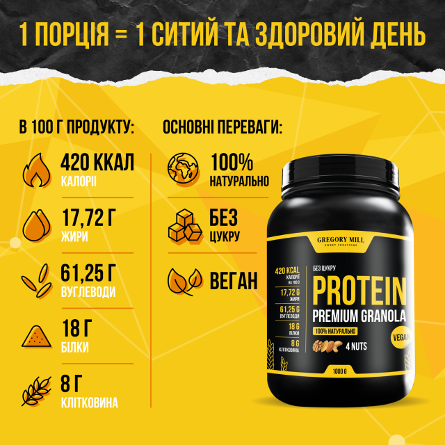 Протеїнова гранола 4 Nuts – створена спеціально для спортсменів, активних людей і всіх, хто хоче більше від життя. Продукт містить високий вміст натурального рослинного білка та клітковини, які підтримують м’язи, забезпечують ситість і допомагають залишатись у формі. Це справжня функціональна їжа з характером.