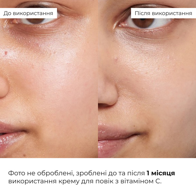 Крем для повік з вітаміном С освітлює, тонізує та зміцнює тонку шкіру, зменшує темні кола й набряки завдяки кофеїну та есцину, а стабілізована форма вітаміну С у поєднанні з вітаміном Е діє як потужний антиоксидант.