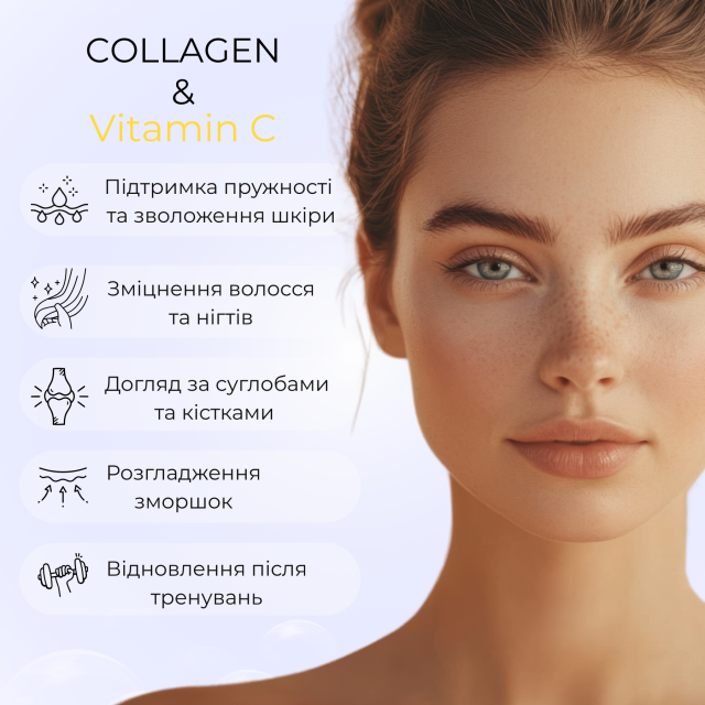 Колаген діє як основний структурний білок, надаючи пружності та міцності шкірі, суглобам, кісткам, зв'язкам та м'язам, а також сприяючи відновленню тканин, зменшенню болю в суглобах, росту м'язів та підтримці серцево-судинної системи. Зменшення його рівня в організмі з віком або через зовнішні фактори призводить до старіння шкіри, проблем із суглобами та зниження загального тонусу.