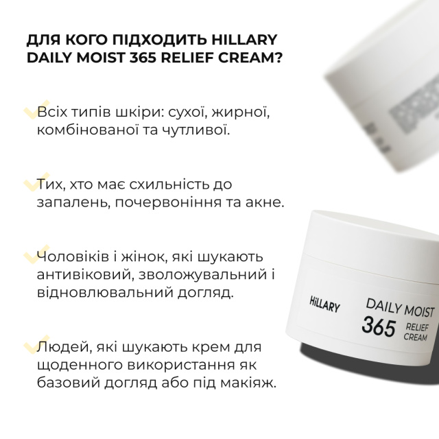 В епоху розумного догляду шкіра потребує більше, ніж просто зволоження. Крем Hillary Daily Moist 365 Relief Cream – мультифункціональний догляд для балансу, захисту та відновлення усіх типів шкіри.