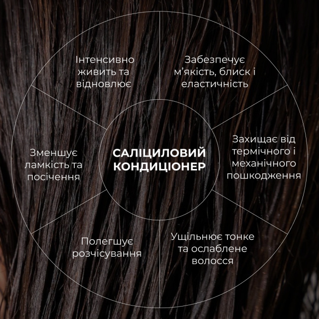 2. Саліциловий кондиціонер. Після миття шампунем нанести кондиціонер на вологе волосся, уникаючи зони коренів. Рівномірно розподілити по всій довжині, приділяючи особливу увагу кінчикам. Залишити на 3-5 хвилин для глибшого впливу, після чого ретельно змити водою.