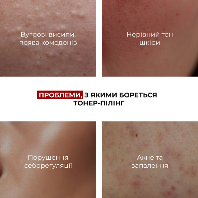 Тонер містить мікс молочної AHA-кислоти та її солі, які полегшують ексфоліацію омертвілих клітин рогового шару та волосяного фолікула, що заважають фізіологічному відтоку себуму. Саліцилова ВНА-кислота проникає в протоки сальних залоз та розчиняє надлишок шкірного сала, надає потужну протизапальну дію.
