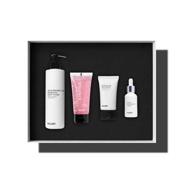 Hillary Present Box Smart Edition – це набір, створений, щоб зробити догляд простим, приємним і результативним. Засоби, які підтримують зволоження, чистоту й доглянутість шкіри щодня. Завдяки поєднанню гіалуронової кислоти, пептидів, колагену та пребіотиків, шкіра зберігає природний баланс, м’якість і здорове сяйво.