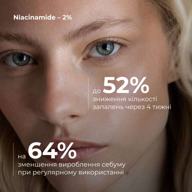 При регулярному використанні гелю, у складі якого Niacinamide 2%, спостерігалось зменшення вироблення себуму на 64%, а кількість запалень знизилась до 52% вже через 4 тижні.