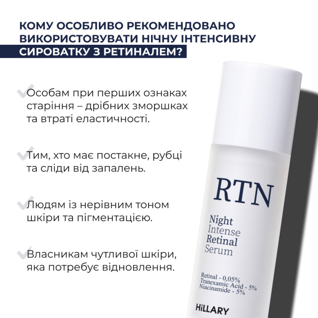 - Нічна інтенсивна сироватка з ретиналем Hillary Night Intense Retinal Serum, 30 мл – щодня.