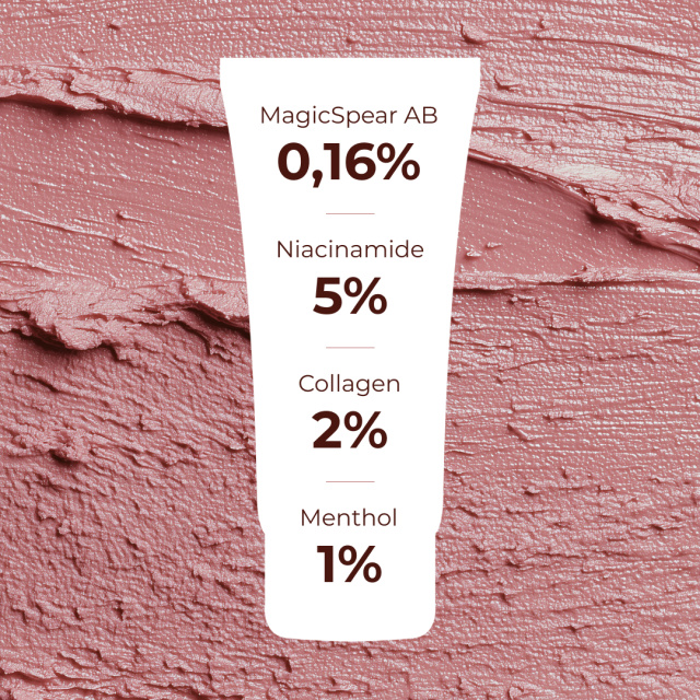 Колаген та пептиди формують омолоджувальний комплекс, стимулюючи відновлення шкіри, підвищують її пружність і зменшують дрібні зморшки, даруючи ефект ліфтингу. Ніацинамід в складі маски вирівнює тон шкіри, зменшує пігментацію і додає шкірі здорового сяйва. Масло ши та бісаболол знімають подразнення і живлять шкіру, тоді як ментол надає приємний охолоджувальний ефект, освіжаючи і тонізуючи.
