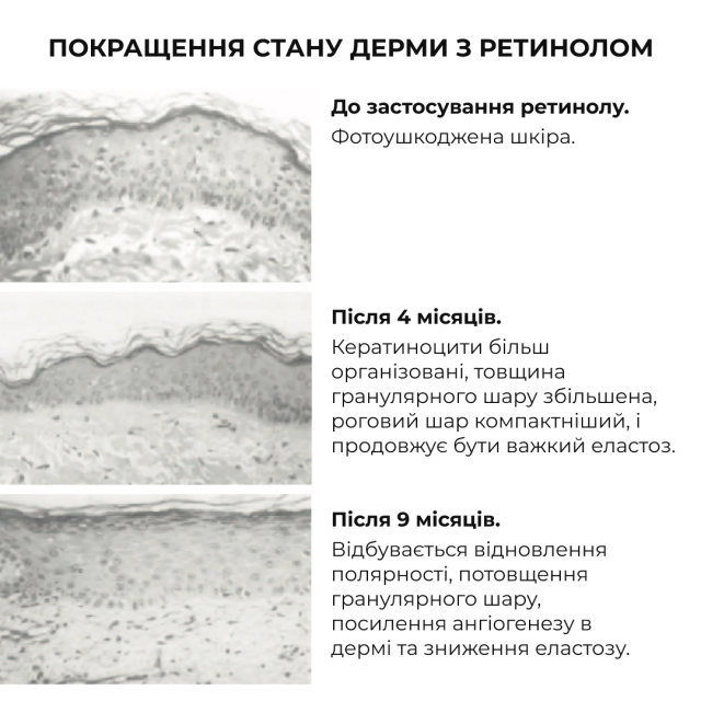 Ретиноїди впливають на епідерміс комплексно, сприяючи його потовщенню та водночас ущільненню рогового шару, що робить шкіру більш гладкою та стійкою до зовнішніх впливів. Вони знижують трансепідермальну втрату води (ТЕВВ), допомагаючи підтримувати оптимальний рівень зволоження. Крім того, ретиноїди стимулюють проліферацію кератиноцитів, що пришвидшує оновлення шкіри, а також підвищують рівень глікозаміногліканів (GAG), які сприяють збереженню вологи. Важливим ефектом є нормалізація полярності кератиноцитів, що запобігає їх злипанню та утворенню рогових пробок.