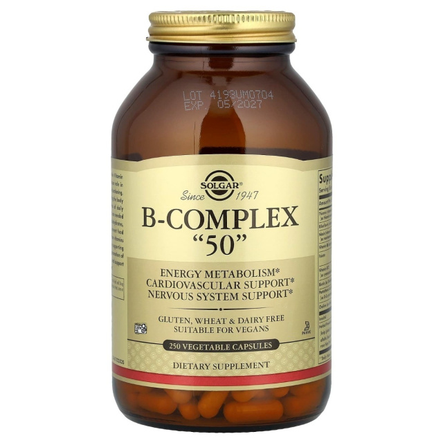 B-Complex "50" від Solgar забезпечує всі водорозчинні вітаміни групи В, які грають важливу роль в клітинному метаболізмі. Колись ця група вважалася одним вітаміном. Пізніше дослідження показали, що вони є окремими складовими, які часто співіснують в одних і тих самих продуктах. Добавки, що містять всі вісім вітамінів групи В (тіамін, рибофлавін, ніацин, піридоксин, кобаламин, біотин, фолат, пантотенова кислота), називаються комплексом вітаміну В.