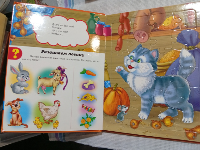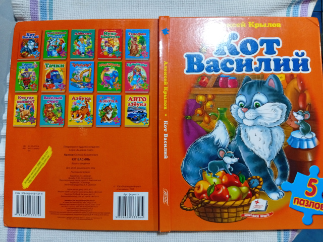 Книжка-пазл «Кот Василий» (издательство «Пегас», Украина) — это развивающая картонная книга для детей дошкольного возраста, объединяющая стихотворения Алексея Крылова с 5 крупными пазлами. Она способствует развитию мелкой моторики, воображения и логического мышления. Книга содержит хитрые сюжеты о коте, который вместо ловли мышей ел сметану.