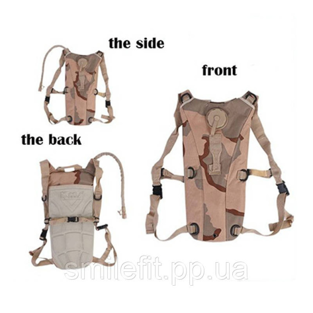 Питна система з рюкзаком - зручний гідратор для військових на 2,5 літри Гідратор для води з рюкзаком на 2,5 літри - це готова недорога питна система, яка буде корисна військовим, солдатам, велосипедистам, мотоциклістам, пішим туристам, мандрівникам, оскільки дозволяє завжди мати з собою за спиною достатній запас питної води - до 2,5 літрів і будь-якої миті її пити через спеціальну трубочку, не дістаючи нічого з рюкзака. Рюкзак гідратор, залежно від модифікації має камуфляжний або чорний колір як на першому фото, виконаний з міцного нейлону і має додаткову велику кишеню на внутрішній стороні по всій висоті рюкзака, в яку влізе навіть Ipad. Клапан для набору води, що відкручується, зручно розташований на зовнішній стороні рюкзака, що забезпечує легкий процес набору води в ємність, без необхідності її витягування з рюкзака. Лямки рюкзака дозволяють зручно відрегулювати розташування рюкзака на спині, а також можуть скріплюватися між собою поперечною лямкою для зручнішої та надійнішої фіксації. Задня частина виконана з рифленої м'якої підкладки з вентиляційними каналами, що дає циркуляцію повітря в місцях прилягання до спини. Сама ємність питної системи має об'єм 2,5 літри. Зверху, із зовнішньої сторни знаходиться широка горловина в яку зручно набирати воду з-під крана або інших джерел, а знизу ємності гідратора знаходиться клапан для приєднання трубки питної системи з різьбленням. Трубка виводиться через спеціальний отвір вгорі рюкзака (як праворуч, так і зліва) і кріпиться на одній з лямок. Коли ви захочете попити - просто витягуєте однією рукою трубку з кріплення, всмоктуєте воду через спеціальний 2х позиційний наконечник на кінці та всовуєте назад в кріплення на лямці - швидко і зручно. Основні особливості Готова питна система з рюкзаком – все в комплекті, нічого не потрібно докуповувати. Об'єм ємності для води - 2,5 літри. Можна заповнювати ємність не дістаючи з рюкзака. Простий у використанні 2-х позиційний клапан на кінці питної трубки, який дозволяє відкривати та закривати подачу води після пиття, щоб унеможливити її розливання, навіть якщо ви покладете гідратор горизонтально. Камуфльований або чорний зовнішній вигляд рюкзака і легка вага, всього 340 г без води. Матеріал – нейлон. Велика додаткова кишеня по всій висоті рюкзака, в яку поміститься навіть Ipad. Питну трубку гідратора можна вивести як праворуч, так і зліва. Задня поверхня, що прилягає до спини - має вентиляційні канали, які забезпечують циркуляцію повітря в місцях прилягання до спини. Вийнявши ємність для води – можна використовувати як звичайний невеликий міський рюкзак. Характеристики Об'єм ємності для води: 2,5 літри. Матеріал рюкзака: нейлон. Можливість регулювання лямок: є. Розміри: 46 x 23 x 5 см. Вага: 340 грам. Колір: різні види камуфляжного кольору або чорний (залежно від модифікації) - зображено на першому фото.