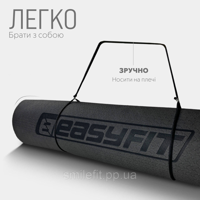 Килимок EasyFit преміальної якості спеціально розроблений для йоги і пілатесу. Мат виготовлений з екологічно чистого (ECO-Friendly) легкого і міцного матеріалу - термопластичного еластомеру (TPE), що забезпечує високі нековзні властивості і оптимальне співвідношення м'якості і пружності для максимально комфортних тренувань. Килимки EasyFit приймають форму поверхні, на якій відбувається тренування, при цьому легко скручується в компактний рулон. Невелика вага килимка забезпечує додаткові зручності для транспортування. Мати EasyFit виробляються на найсучаснішому обладнанні і відрізняються найвищою довговічністю порівняно з будь-якими іншими аналогами.