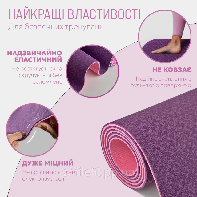 Килимок для йоги та фітнеса EasyFit TPE+TC 6мм двошаровий + Чохол фіолетовий з рожевим, Київ
