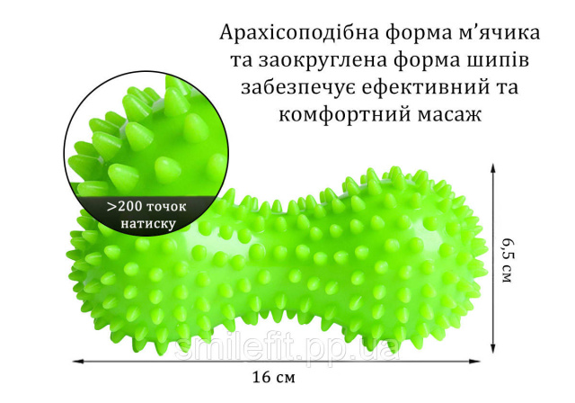 Масажний м'ячик арахіс розміром 16х6,5 см, що дозволяє носити його з собою навіть у кишені, і займатися будь-де: вдома, на роботі, у транспорті або в тренажерному залі під час перерви. Він особливо корисний у реабілітаційних та лікувальних цілях. Масажер виготовлений із екологічно чистого полімеру.