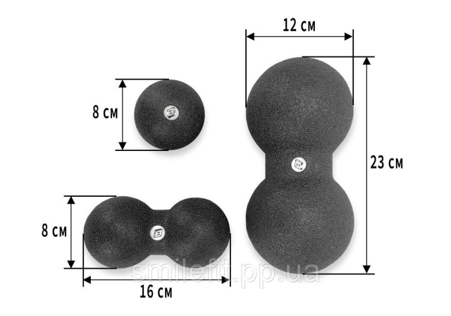 М'ячик діаметром 23х12 см - масажний м'яч подвійний ідеально підходить для опрацювання великих груп м'язів, таких як спина, стегна та сідниці. Його розміри дозволяють глибоко опрацювати м'язи та зняти напругу.