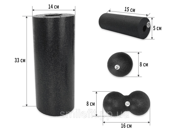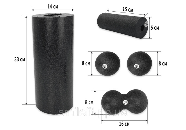 Масажний набір EasyFit MioSet-3 - це класичний набір для масажу та релізу всіх м'язів. Він універсальний та відрізняється серед усіх наборів своєю максимальною комплектацією. Набір для масажу складається з одного м'ячика розміром 16х8 см (подвійний), м'ячик 8 см, а також два ролика розмірами 15х5 см і 33х14 см. М'ячики і валики виготовлені з матеріалу ЕПП (екструдований поліпропілен), який унікальний твердістю і довговічністю. Комплект масажних елементів ефективний та допомагає підтримувати здоров'я м'язів, знижувати стрес, покращуючи загальне самопочуття.