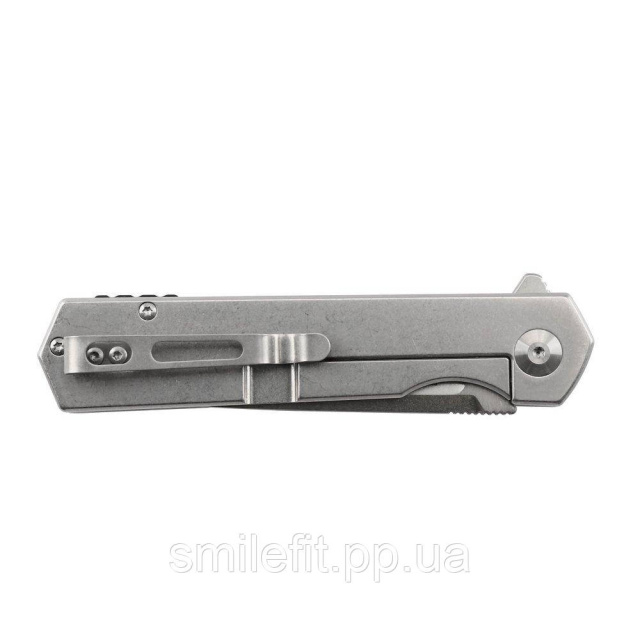 Метал для форматування рукоятки використовується інший – нержавіюча сталь. Щоб ніж зручно лежала в руці і не ковзав, у його ручки прямі обриси з невеликою виїмкою для пальців знизу. А носити його в кишені найзручніше, закріпивши для надійності металевої кліпсою, прикрученою з однією з сторін рукоятки. За бажанням власника, цей елемент можна переставити на іншу сторону.
