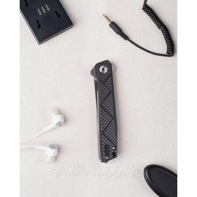 Виріб являє собою складаний ніж з прямою рукояткою забарвлення «карбон». Ручка моделі має геометричний малюнок. Загальна довжина ножа становить 21,5 сантиметри, вага – 112 грамів. Довжина клинка при цьому трохи перевищує 9 сантиметрів, а товщина його дорівнює 3,1 міліметра.
