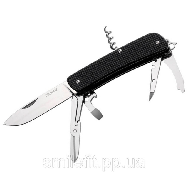 Крім клинка з прямою заточкою, модель Ruike L31 також має підвантажені ножиці, невелике лезо з хвилеподібною заточкою, викрутку з прямим шліцом, поєднану з відкривачкою, багатофункціональний шило, відкидне вушко для кріплення темляка, штопор, склобій, а також знімні щипці, «заховані» в одній з «пластин» рукояті.