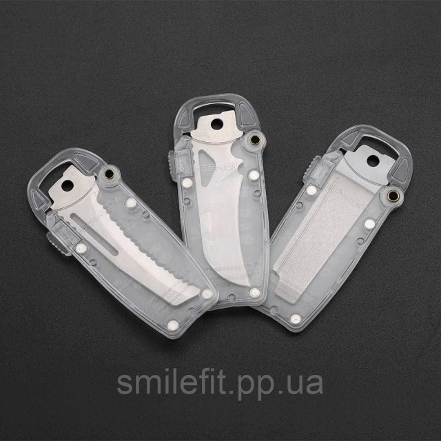 Крім змінних клинків, до набору входять фірмові чохли, розроблені ексклюзивно для цих аксесуарів. Чохли виготовлені з прозорого, зносостійкого матеріалу, що уберігає леза від негативного впливу вологи та робить їх носіння безпечним. У верхній частині кожного чохла є наскрізний отвір та імпровізована петля для кріплення на шльовці штанів.