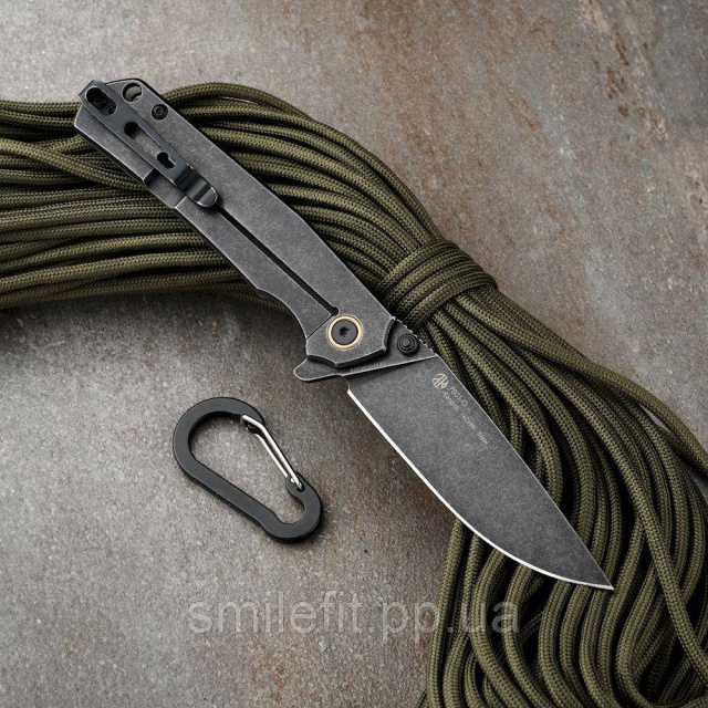 клинок зі сталі Sandvik 14C28N з чорним покриттям;