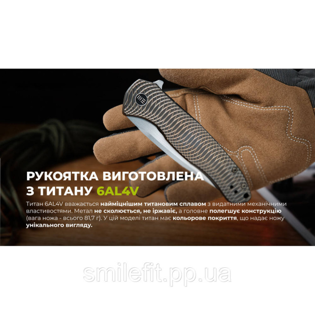 Руківʼя виготовлене з титану 6AL4V, який вважається найміцнішим титановим сплавом з визначними механічними властивостями. Метал не сколюється, не іржавіє, а головне — полегшує конструкцію. До того ж у цій моделі титан має кольорове покриття, що надає ножу унікального вигляду.