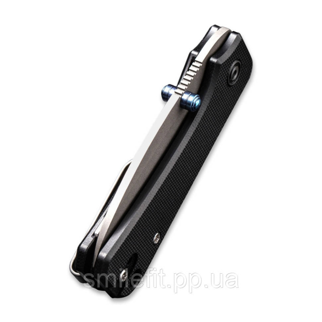 Опис складаного ножа Civivi Baby Banter C19068S-1:Ніж Civivi Baby Banter — компактний EDC інструмент, розроблений американським дизайнером Беном Петерсеном. Ця модель є зменшеною копією повноформатного аналога Civivi Banter, яка адаптована під повсякденне носіння у кишені в межах міста.Складана конструкція складається з короткого клинка довжиною 59.4 мм та руківʼя, товщина якого не перевищує 10.3 мм. Матеріал клинка — високовуглецева сталь Nitro-V. Метал включає велику кількість ванадію та азоту, що підвищує стійкість до корозії. Поверхня сталі відрізняється матовістю завдяки обробці stonewash, в результаті якої усувається металічний блиск, а подряпини та відбитки пальців стають менш видимими.Клинок із прямим заточуванням розкривається за допомогою шпеника, який виготовлений з титану 6AL4V з блакитним покриттям. Фіксувальний механізм — стандартний замок liner lock, є керамічний кульковальник. Додатковий комфорт експлуатації забезпечують рифлений упор під палець на обуху та виїмка під вказівний палець, що захищає від зісковзування руки на лезо.Склотекстолітові плашки на руківʼї не тріскаються у разі удару, не змінюють колір та форму під впливом сонячних променів, олій, кислот. Краї спеціально закруглені, щоб руківʼя не давило долоню. У хвості конструкції є двопозиційний затискач з нержавіючої сталі та широкий отвір для темляка.Модель важить лише 56.5 грамів і має довжину 79.3 мм у складеному положенні.Характеристики:кишеньковий EDC ніж, зменшений варіант моделі Civivi Banter;колір – чорний;матеріал клинка – високовуглецева сталь Nitro-V;твердість сталі – 59-61 HRC;тип заточування – прямий;обробка клинка за методом stonewash;замок liner lock;відкривання за допомогою шпеника з титану 6AL4V;матеріал руківʼя – склотекстоліт G10;довжина ножа у розкритому вигляді – 138.7 мм;довжина клинка – 59.4 мм;товщина клинка – 2.3 мм;довжина у складеному положенні – 79.3 мм;товщина руківʼя – 10.3 мм;вага – 56.5 г;є сталева кліпса.