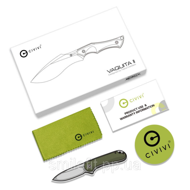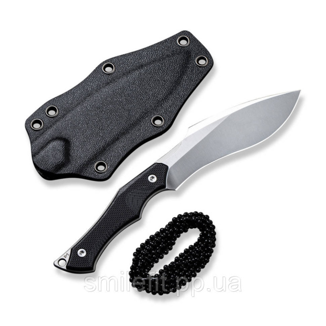 Опис ножа Civivi Vaquita II C047C-1:Ціліснометалева конструкція (фултанг) робить з ножа Civivi Vaquita II міцного та зносостійкого помічника у повсякденних завданнях, навіть попри мініатюрні розміри моделі. Це зменшена версія повноформатного інструменту Vaquita, розроблена ножовим дизайнером Нейтом Метлеком (Nate Matlack).Форма клинка — кукрі з вираженими вигнутими лініями, що полегшують як різання матеріалів різної щільності, так і їх проколювання. Гострий кінчик миттєво встромляється в матеріал, а пряма різальна крайка завдовжки 85.7 мм відрізняється універсальністю в експлуатації та простотою в заточуванні.Сталь Nitro-V у клинку забезпечує інструменту стійкість перед ударними навантаженнями й довговічність завдяки вмісту ванадію та азоту, які підвищують антикорозійні властивості металу. Твердість марки дорівнює 59-61 HRC. Поверхня клинка сатинована, тому на ній не залишається відбитків пальців, а дрібні подряпини є невидимими. Довжина клинка сягає 81.3 мм.Щоб утримання ножа було зручним і міцним, його руківʼя доповнене накладками по обидва боки конструкції. Їх матеріал — склотекстоліт G10, який широко застосовується у ножовій промисловості завдяки оптимальному співвідношенню таких якостей, як ударо- та жароміцність, несприйнятливість до впливу вологи. Вага моделі складає 39 грамів. У хвості є наскрізний отвір під темляк.Комплект постачання включає чорні піхви з кайдекса, в яких фіксований ніж зберігається без люфтів і додаткових шумів під час транспортування. У піхвах є отвір для зливу води, а також сім отворів по боках аксесуара, які пропонують необмежену кількість варіантів носіння інструменту. В них можна просмикнути шнурок і фіксувати піхви на поясі або лямці рюкзака. Включений до набору сталевий ланцюжок підходить для носіння ножа на шиї.Характеристики:суцільнометалевий EDC ніж із фіксованим клинком;дизайнер – Нейт Метлек;матеріал клинка – нержавіюча сталь Nitro-V (59-61 HRC);клинок форми кукрі з прямим заточуванням;обробка методом сатинування;матеріал накладок на руківʼї – склотекстоліт G10;довжина конструкції – 158.3 мм;довжина клинка – 81.3 мм;довжина леза – 85.7 мм;товщина в обуху – 2.3 мм;товщина руківʼя – 7.3 мм;вага ножа – 39 г;загальна вага з піхвами та пакуванням - 180 г;до набору входять піхви з кайдекса та сталевий ланцюжок на шию.
