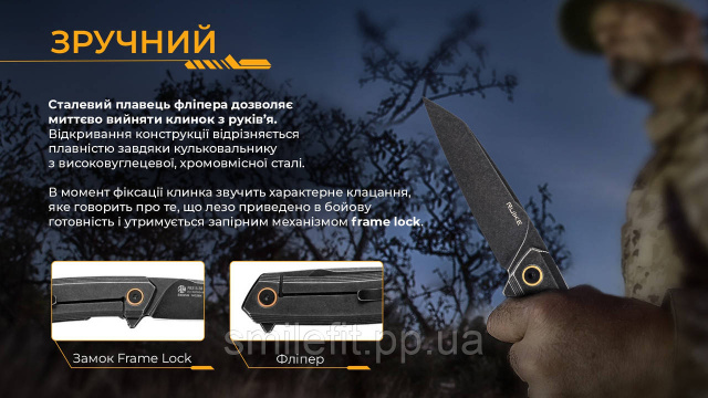 Відкривання конструкції відрізняється плавністю завдяки кульковальнику з високовуглецевої, хромовмісної сталі. В момент фіксації клинка звучить характерне клацання, яке говорить про те, що лезо приведено в бойову готовність і утримується запірним механізмом frame lock. Повна довжина ножа дорівнює 195 мм.