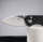 Матеріал руківʼя — склопластик G10, що часто застосовується у виробництві EDC ножів через його ударостійкість та несприйнятливість до температурних перепадів. Карбонове напилення прикрашає дизайн і слугує додатковим шаром, що зміцнює руківʼя на випадок механічного впливу. Отвір у хвості призначений для фіксації паракорду.