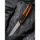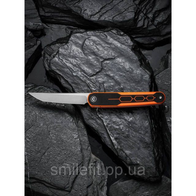 Руківʼя чорно-помаранчевого кольору виконане з надміцного композиту G10. Матеріал не боїться вологи, екстремально високих та низьких температур, впливу хімічних сполук, а також не вбирає запахи. Попри витончений дизайн, ніж комфортно лягає у долоню, оскільки плашки мають цупку поверхню.