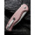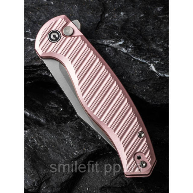 Модель має складану конструкцію: 83.8 мм припадають на клинок з прямим заточуванням, а 110.3 мм — на руківʼя ніжно-рожевого відтінку. Для розкриття леза достатньо натиснути на плавець фліпера, після чого ніж миттєво відкривається до фіксації, за яку відповідає замок button lock. Виробник приділив особливу увагу механіці та укомплектував інструмент керамічними підшипниками, що значно покращило плавність ходу леза.