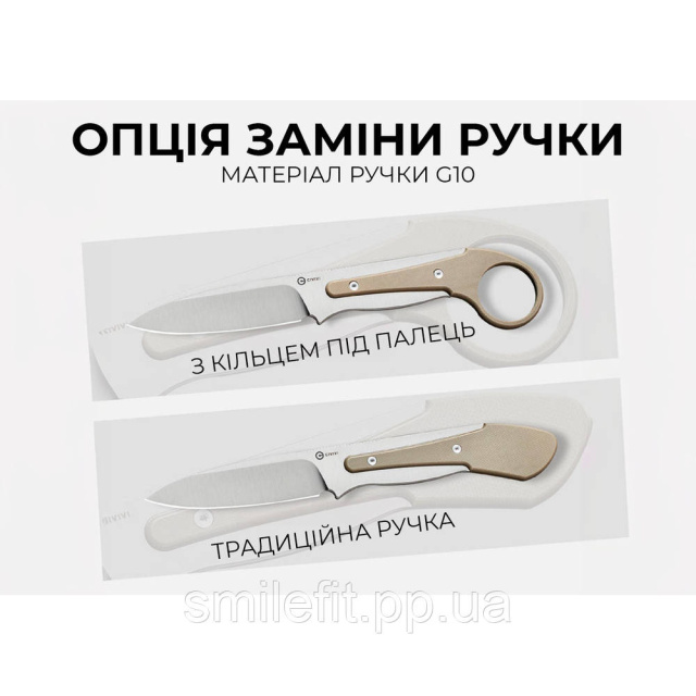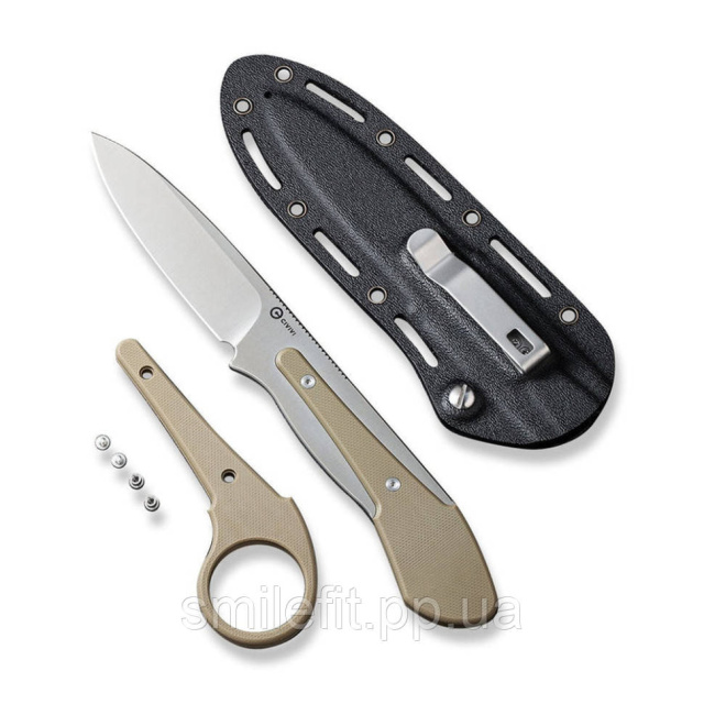 Головна ж особливість ножа Civivi Varius — унікальна конструкція з можливістю кастомізації руківʼя за допомогою 2 типів накладок на вибір: класичних прямих або з хвостовим отвором. Накладки входять до комплекту разом із двома парами кріплень, пропонуючи розширену кількість варіантів хвату руківʼя. Матеріал накладок — склопластик G10 з шорсткою поверхнею, яка не дає долоні ковзати по руківʼю.