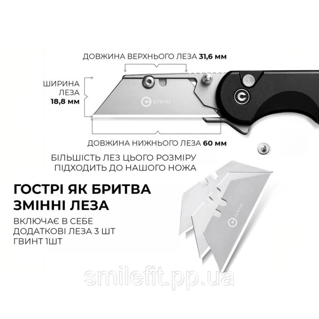 Ніж оснащений канцелярським ножем замість класичного клинка, тому стане в пригоді не тільки для вирішення повсякденних завдань, а й для професійної діяльності. Тонке лезо акуратно й точно ріже картон, мотузки, вироби зі шкіри, пластику та гуми. У наборі є 3 змінні клинки ідентичної форми. Всі вони виготовлені з нержавіючої сталі 6Cr, обробленої методом галтування для усунення блиску металу.