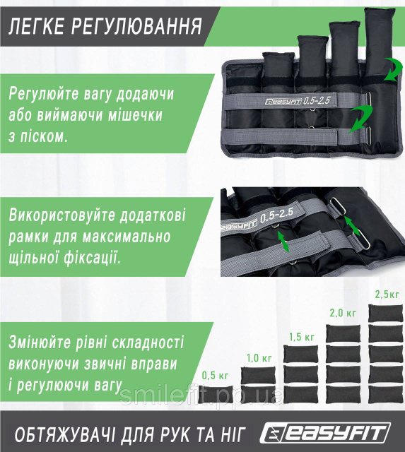Обтяжувачі набірні EasyFit складаються з 5 мішечків по 0,5 кг і манжети для фіксації на руці або нозі. Це дозволяє поступово змінювати вагу, обираючи оптимальне навантаження на тренуваннях. Обтяжувачі виконані з міцного матеріалу, що гарантує тривалий термін служби. Кріплення на липучках забезпечують зручність при знятті-одяганні обтяжувачів, а також максимальний комфорт при виконанні вправ. Функціональність набірних обтяжувачів дозволяє використовувати їх зі зручністю для ніг, і для рук, регулюючи при цьому вага і відповідно розмір манжети. З обтяжувачами можна проводити як силові, так і кардіотренування. Сучасність дозволяє обрати з широкого асортименту напрямків спортивних занять саме те, що по душі, а комбінуючи їх досягати нових цілей.