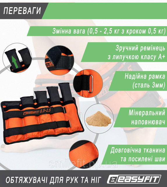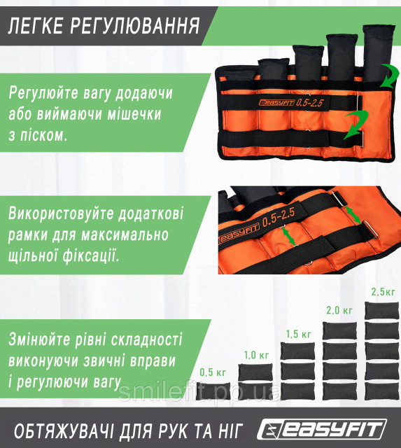 Обтяжувачі набірні EasyFit складаються з 5 мішечків по 0,5 кг і манжети для фіксації на руці або нозі. Це дозволяє поступово змінювати вагу, обираючи оптимальне навантаження на тренуваннях. Обтяжувачі виконані з міцного матеріалу, що гарантує тривалий термін служби. Кріплення на липучках забезпечують зручність при знятті-одяганні обтяжувачів, а також максимальний комфорт при виконанні вправ. Функціональність набірних обтяжувачів дозволяє використовувати їх зі зручністю для ніг, і для рук, регулюючи при цьому вага і відповідно розмір манжети. З обтяжувачами можна проводити як силові, так і кардіотренування. Сучасність дозволяє обрати з широкого асортименту напрямків спортивних занять саме те, що по душі, а комбінуючи їх досягати нових цілей.