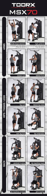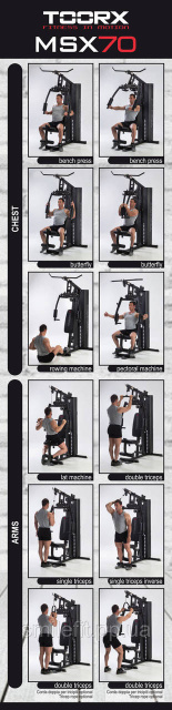 Мультистанція Toorx MSX 70 – це сучасний багатофункціональний тренажер, який об’єднує професійний рівень навантажень із компактністю для домашнього використання. Завдяки міцному стальному каркасу та 102 кг вантажного стека в захисному кожусі, вона гарантує довговічність і стабільність навіть при інтенсивних силових сесіях. Клас тренажера: Home line (для домашнього використання) Особливості: Вага стека - 102 кг із кроком 6,8 кг. Комбінований жим від грудей, батерфляй і тяга сидячи з упором грудей. Верхній блок для тяги за допомогою широкої ручки. Нижній блок для тягових вправ за допомогою прямої ручки. Розгинач для ніг із поролоновими валиками з покриттям з екошкіри. Розгинач для ніг регулюється в 3-х положеннях (по горизонталі). Сидіння регулюється у 2-х положеннях (по вертикалі). Спинка регулюється в 6-х положеннях (по горизонталі). Основа сидіння та спинки — поролон високої щільності з покриттям із екошкіри. Рама зі сталевої квадратної труби 65x65 мм. Порошкове фарбування рами стійке до подряпин. Сталеві троси із поліуретановим покриттям. Система блоків із кульковими підшипниками. Захист вантажного блоку для додаткової безпеки. В комплекті широка ручка для тяги, пряма ручка для тяги, вузька ручка для тяги, лямка для ноги. Основні вправи: Груди: Фронтальний жим (front press), пекторальний мах (pectoral fly) – до 43 кг на кожну сторону (dual function butterfly) Спина: Тяга верхнього блоку (lat pull down), горизонтальна тяга сидячи (seated pulley row), зворотній жим (back press), режим «гребля» (rowing) на механізмі butterfly Плечі та трапеції: Upright row (тяга штанги до підборіддя), підіймання колін вперед стоячи (standing shoulder/knee raise) Руки: Розгинання рук на трицепс (tricep push down), згинання рук на біцепс (biceps curl) Ноги: Розгинання ніг (leg extension) з 3 рівневим горизонтальним регулюванням, згинання ніг назад (leg kick back), стояче згинання ніг (standing leg curl) Прес: Скручування корпусу (abdominal crunch), поєднане підведення зверху зі скручуванням (high pull AB crunch) Ключові технічні дані Вантажний стек: 102 кг із повним захисним кожухом Максимальна вага користувача: 135 кг Розміри сидіння: 37 × 33 × 6,5 см (складне, з двоколірною оббивкою) Регулювання сидіння: 2 рівні по вертикалі Розміри спинки: 68 × 33 × 6 см Регулювання спинки: 6 рівнів по горизонталі Система направляючих роликів: подвійні алюмінієві направляючі з кулястими підшипниками Кабелі: стальні троси в поліуретановому покритті Ролики для щиколоток: пінна оббивка з екошкіри Рама: квадратні профілі 65 × 65 мм, подвійне порошкове покриття, стійке до подряпин Вага тренажера: 170 кг Габарити у зібраному стані: 146 × 92 × 213,5 см (122,5 × 92 × 213,5 см зі складеним сидінням) Загальна вага (з упаковкою): 185 кг Розміри упаковки: 194 × 52 × 19 см 53 × 44 × 18,5 см 180 × 28 × 22,5 см 3× (49,5 × 29 × 19,5 см) Рекомендації з експлуатації тренажерів Toorx: З метою уникнення передчасного зносу або несправності, регулярно здійснюйте профілактичні перевірки тренажерів. Регулярно перевіряйте та змащуйте рухомі частини (напрямні, підшипники). Використовуйте спеціальні мастила для спортивного обладнання. Перевіряйте стан кріплень, болтів та інших деталей. У разі ослаблення – негайно затягніть їх.