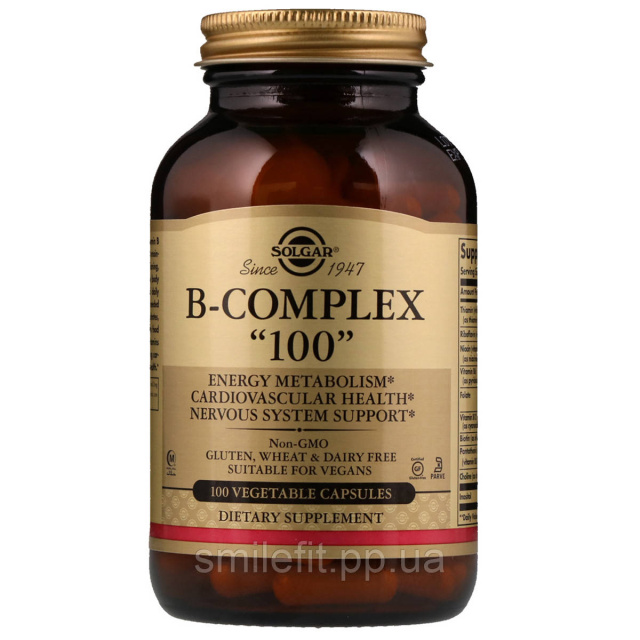 B-Complex "100" від Solgar забезпечує всі водорозчинні вітаміни групи В, які грають важливу роль в клітинному метаболізмі. Колись ця група вважалася одним вітаміном. Пізніше дослідження показали, що вони є окремими складовими, які часто співіснують в одних і тих самих продуктах. Добавки, що містять всі вісім вітамінів групи В (тіамін, рибофлавін, ніацин, піридоксин, кобаламин, біотин, фолат, пантотенова кислота), називаються комплексом вітаміну В.