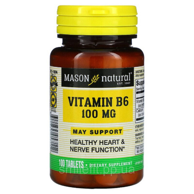 Вітамін B6 100 мг, Vitamin B6, Mason Natural, 100 таблеток, Київ