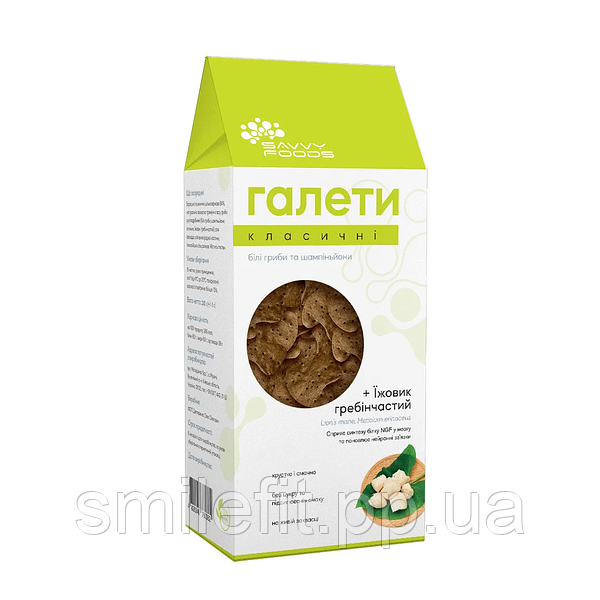 Порція грибних галет закриває обидва питання своєю хрусткістю та користю. Тут присутня ціла команда активних грибів, зокрема їжовик гребінчастий, який покращує роботу нейронів. А ще, ці галети гарантовано смачні – ідеальний перекус, за який не соромно перед власним здоров’ям.